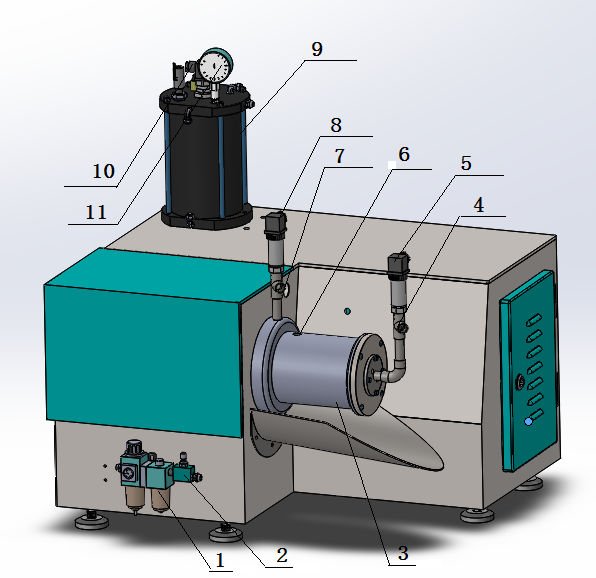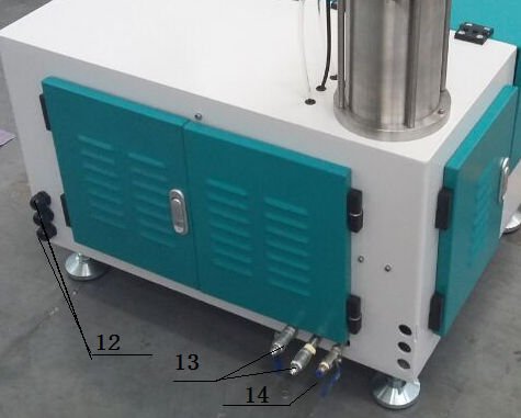 1、油水分离器 控制隔膜泵气体压力; 2、节流阀 调节隔膜泵气体流量,控制进料速度; 3、研磨缸冷水入口; 4、出料口; 5、温度变送器:输出出料温度信号,可设置出料保护温度; 6、研磨缸冷水出口; 7、进料口; 8、压力变送器:输出进料压力信号,可设置进料压力保护 9、冷却罐 10、液位开关 设置液位高度,低于设定液位时设备无法工作 11、压力表:显示冷却罐压力 12、电缆线接头:设备主体和电控柜走线位置 13、冷却水进水口和回水口; 14、进气口。