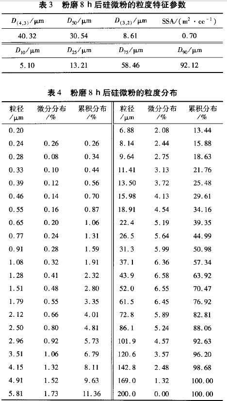 是30.54 ixm。由表4可以看出,粉磨8 h后硅微粉的粒径为43.9 m时微分分布***,为6.58% ;***粒径169.0 m,对应的微分分布为1.32%。