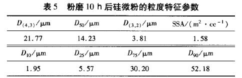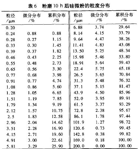 由表5可知,粉磨10 h后硅微粉的中位径D 。是14.23/a,m。由表6可以看出,硅微粉的粒径为22。4Ixm时的微分分布***,为5.75% ;***粒径169.0m,其对应的微分分布为0.18%。