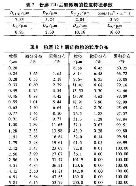 由表7可以看出,粉磨12 h后硅微粉的中位径D 是5.24 Ixm。由表8看出,硅微粉的粒径为8.14 m时的微分分布***,为6.48% ;***粒径72.8 I.Lm,其对应的微分分布为0.01%。不经分级可以获得百分含量占99.99% 、粒径为61.5 Ixm以下的硅微粉。