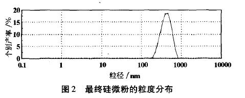 由表1可知,粉磨6 h后硅微粉的中位径,) 。是32.50 m。由表2可看出,粉磨6 h后硅微粉的粒径是43.9 m时的微分分布***,是7.17% ;***粒径是169.0 m,对应的微分分布为1.07%。