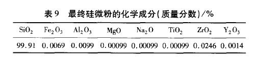 ***终硅微粉的化学成分见表9。由表9可知,***终硅微粉的SiO,含量可达到99.9l% ,其它组分含量很低,已达到和超过环氧塑封料等用途的硅微粉品质要求。***终硅微粉被污染的程度小,由于研磨介质球磨损带进的ZrO 杂质仅占0.0246% ,带进的Y O 杂质为0.0014%